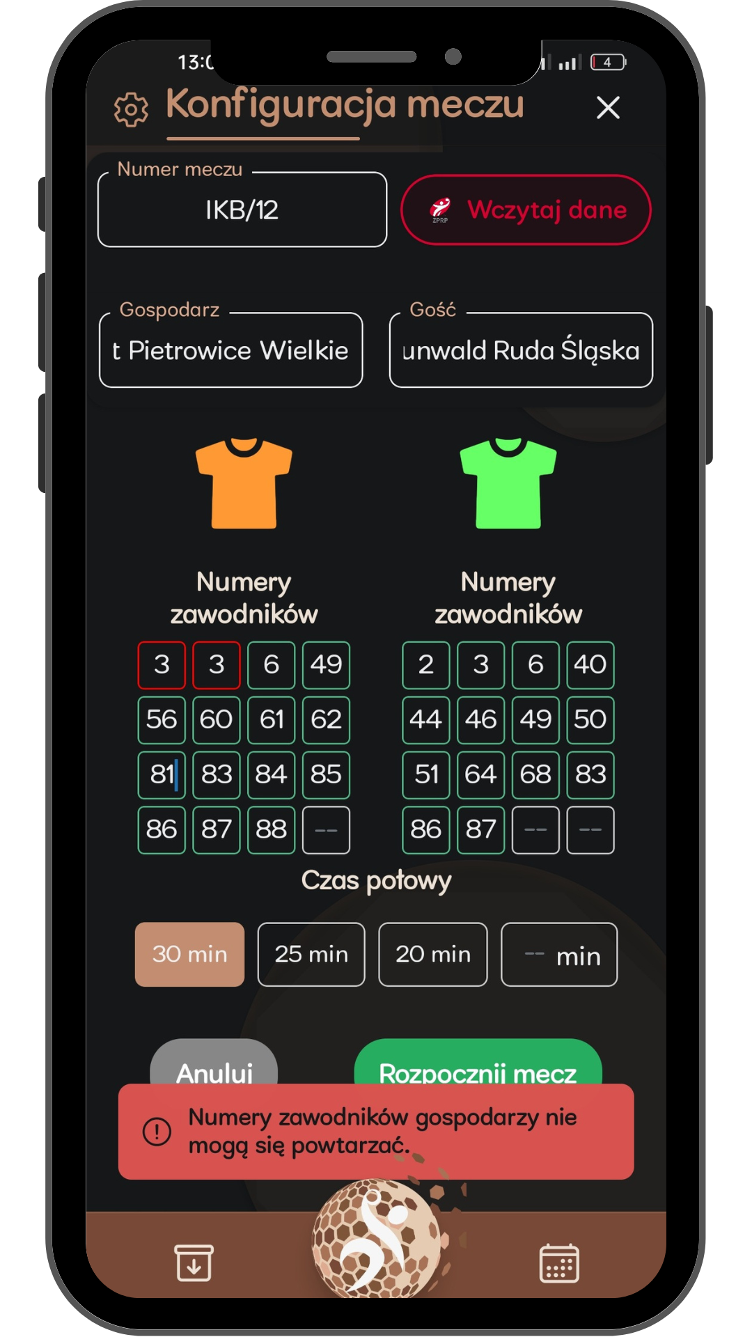Konfiguracja numerów, kolory strojów, czas połowy...to właśnie możesz ustawić już przed rozpoczęciem meczu aby dopasować działanie ProEla do dowolnego meczu.