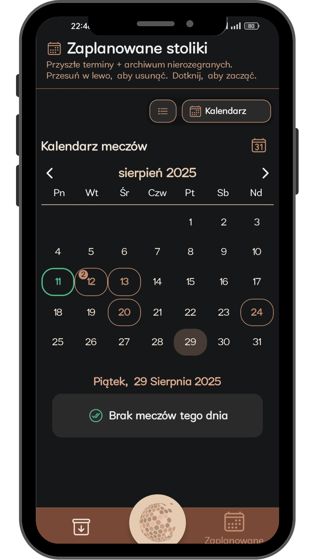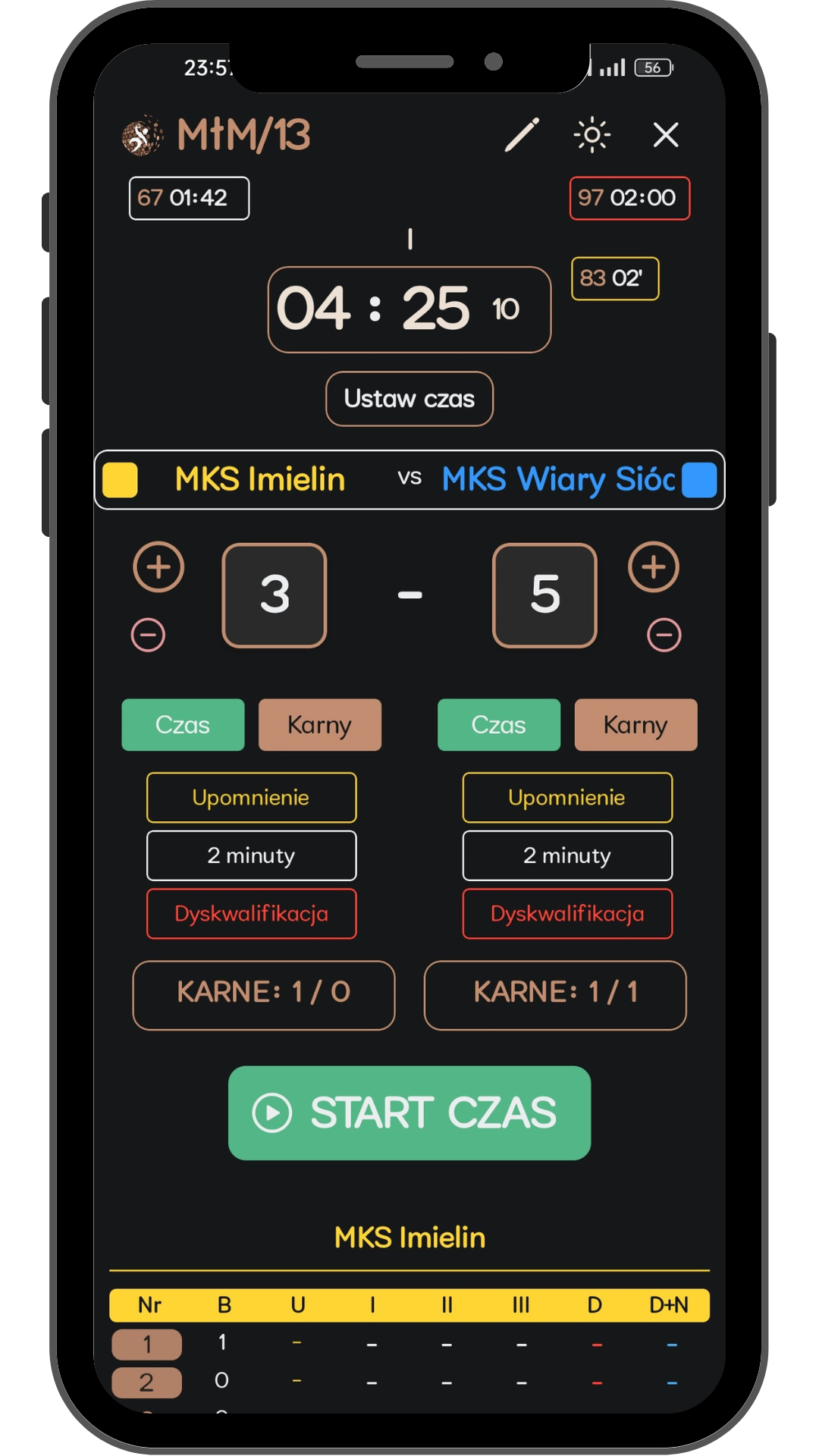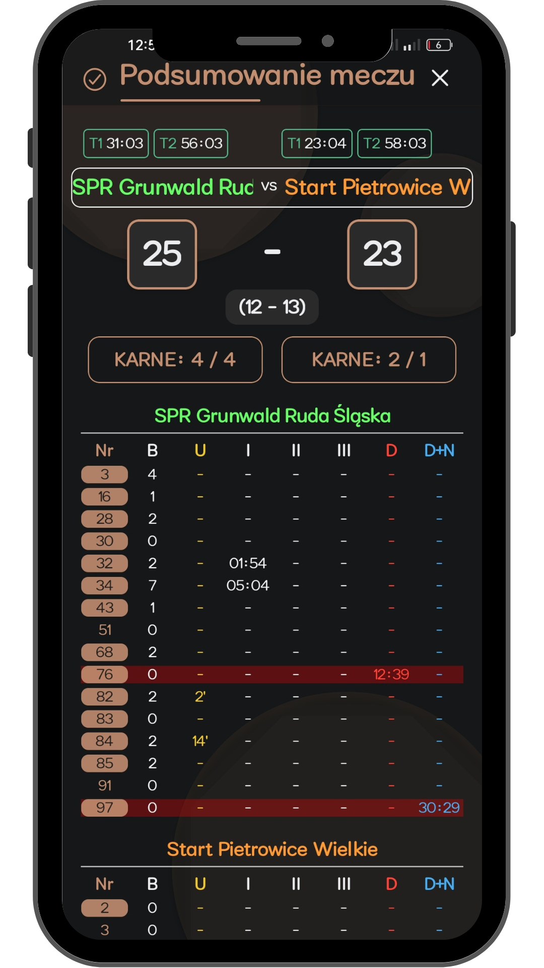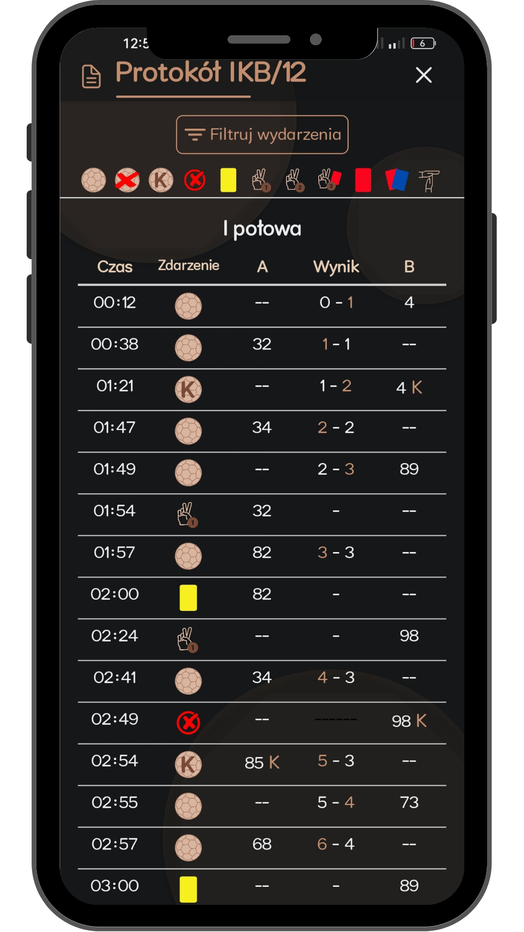 Wszystko w jednej tabeli: bramki, kary, timeouty, karne — z ikonami i filtrem, który w sekundę pokaże tylko to, co potrzebne. Protokół, który już znasz...ale lepszy.